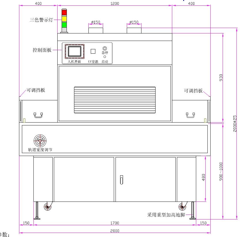 | 1、UV燈功率:6.0kw*2支(汞燈) | 2、UV燈總長:620mm、弧長:500mm |