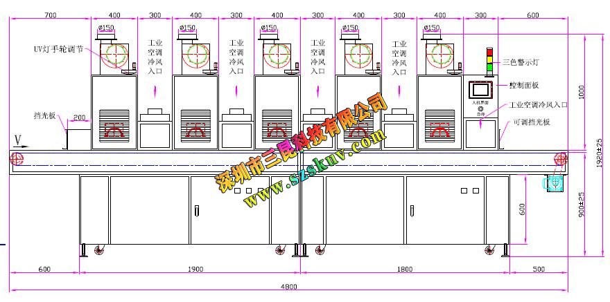 | 1、UV燈功率:6.0kw*5支(鹵素燈) | 2、UV燈總長:620mm、弧長:500mm |