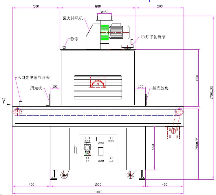 | 11、輸送速度:0~5m/min(速度表直接讀數) | 12、入口高度:100mm |