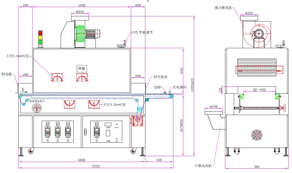 | 1、UV燈功率:5.0kw*4支(UV汞燈) | 2、UV燈總長(zhǎng):620mm、弧長(zhǎng):500mm |
