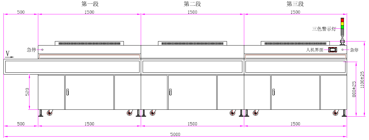 9、輸送速度:0~5m/min(每段速度單獨控制) 10、入口高度:35mm